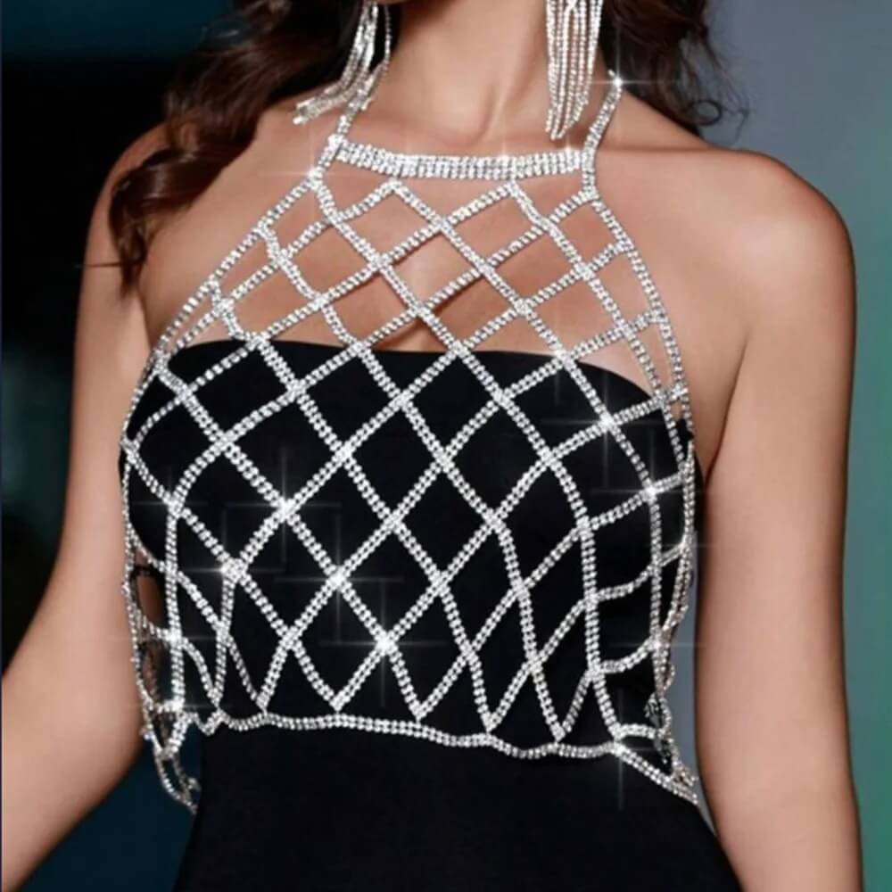 Découvrez le bijou de corps Calyra, une pièce audacieuse conçue pour captiver la lumière et sublimer votre silhouette. Sa structure effet résille métamorphose instantanément un top bustier ou une robe de soirée, ajoutant une dimension de glamour et de sophistication à votre look.