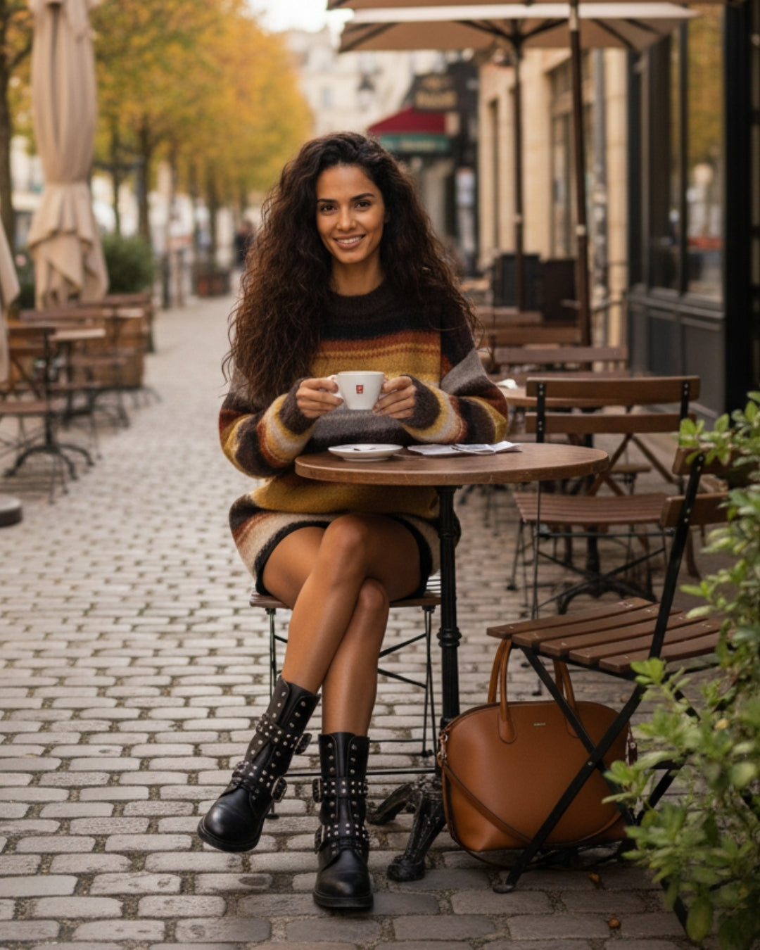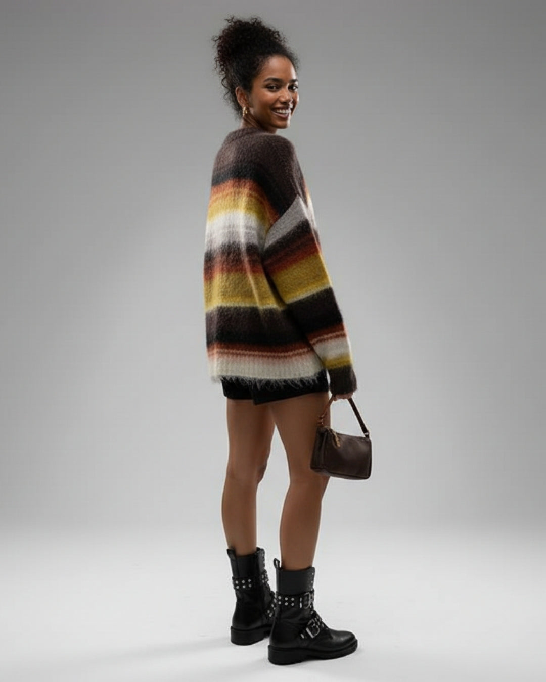 Design Graphique et Tendance : Les larges rayures multitonales structurent la silhouette et apportent une touche de modernité audacieuse à vos tenues, du jean décontracté à la jupe plus habillée.