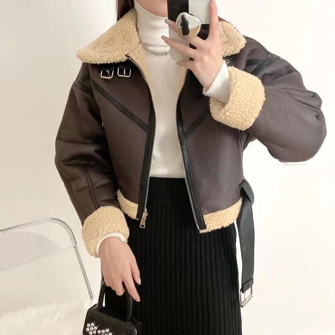Contraste Texturé : L'association du similicuir lisse et du sherpa douillet au col, aux poignets et au bas du blouson crée un jeu de matières visuellement riche et moderne.