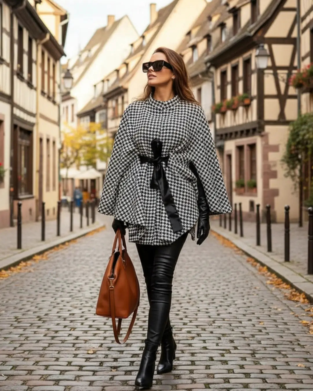 Découvrez la cape poncho Jade, une pièce maîtresse qui allie la fluidité d'une cape à l'élégance d'une silhouette structurée. Son motif à carreaux intemporel est sublimé par une large ceinture à nouer, vous permettant de dessiner votre taille avec grâce. Conçue pour offrir une liberté de mouvement absolue, elle enveloppe la silhouette dans un drapé moderne et sophistiqué.