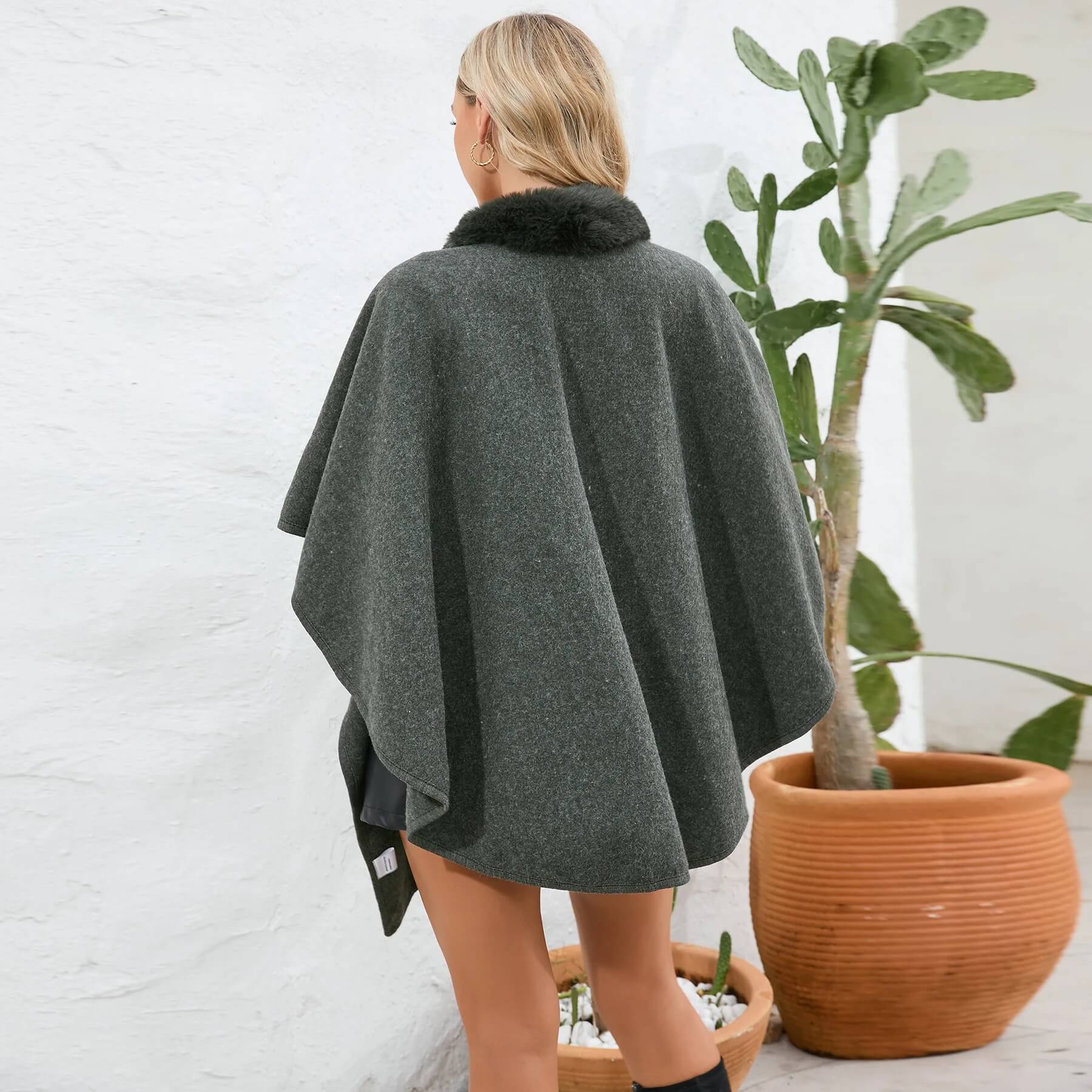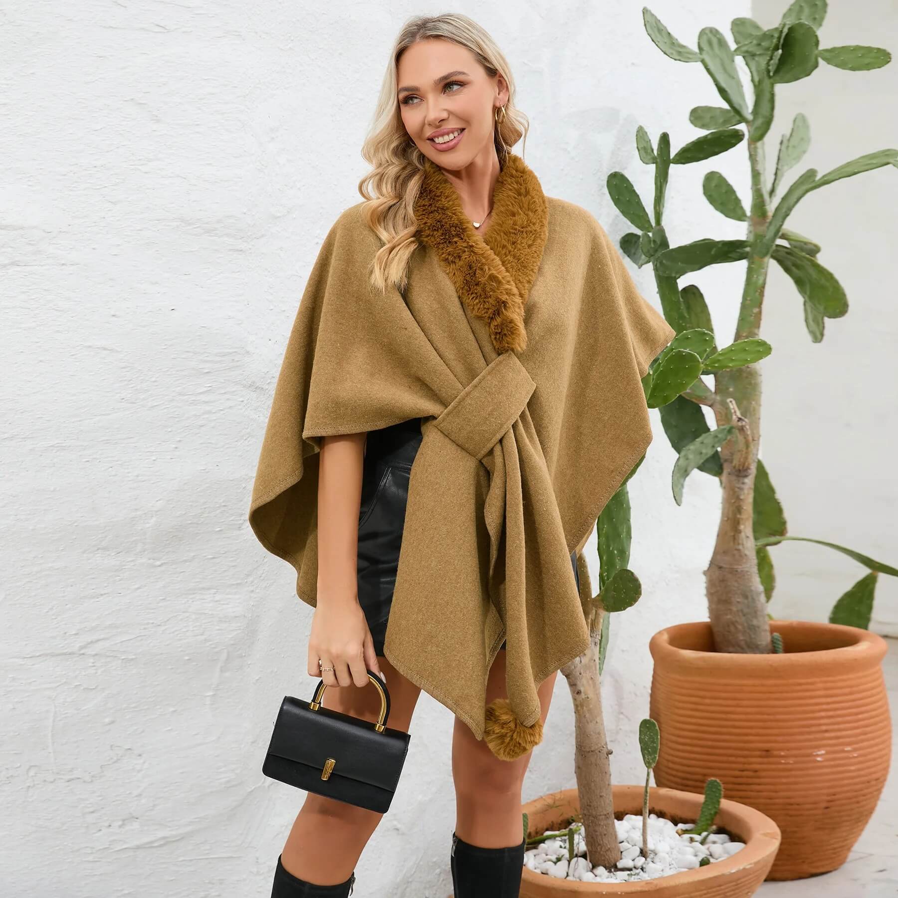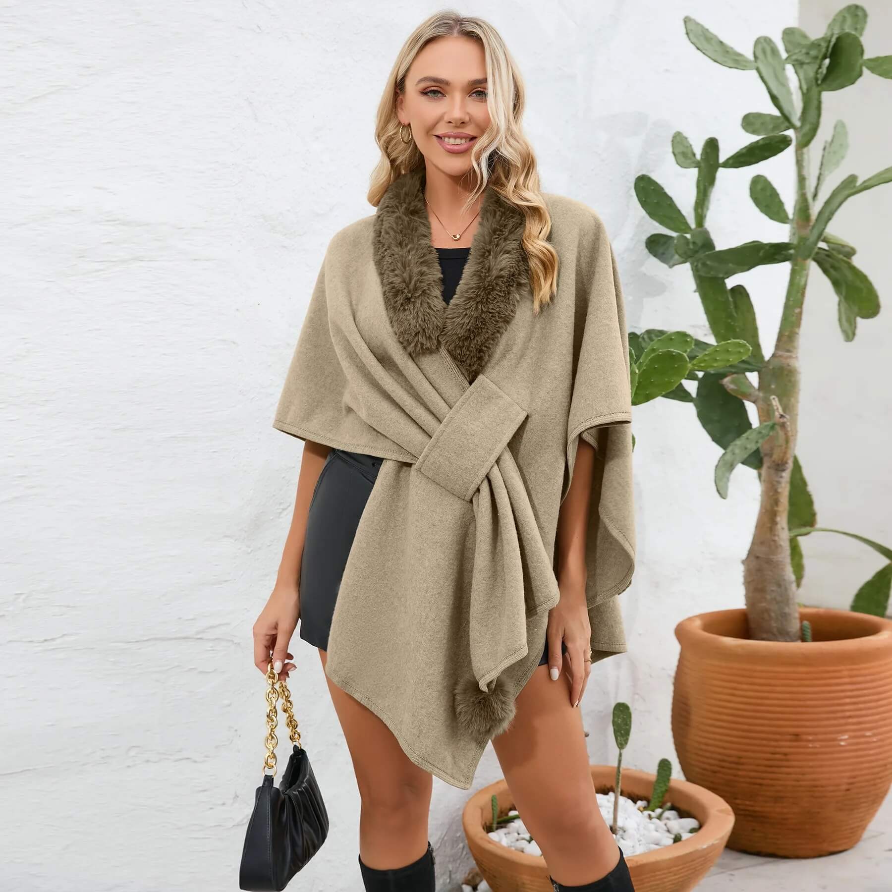La cape poncho Léna est la pièce maîtresse qui allie confort et sophistication pour la saison fraîche. Sa coupe ample et sa ceinture délicate dessinent une silhouette élégante, tandis que son col opulent en fausse fourrure apporte une touche de luxe et de chaleur.