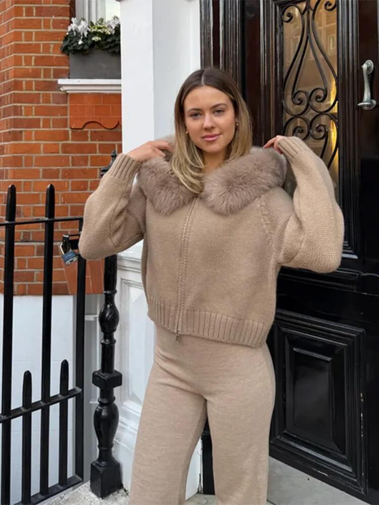 Col Signature en Fausse Fourrure : Volumineux et incroyablement doux, le col en fausse fourrure transforme ce cardigan en une pièce forte. Il encadre le visage avec élégance et apporte une touche de luxe instantanée à votre silhouette.
