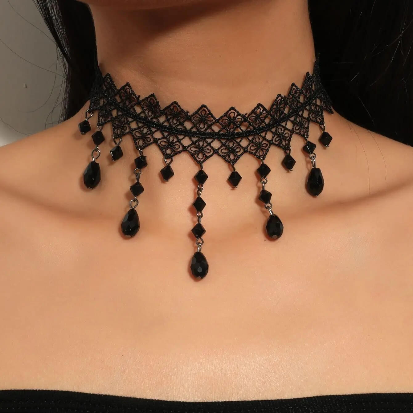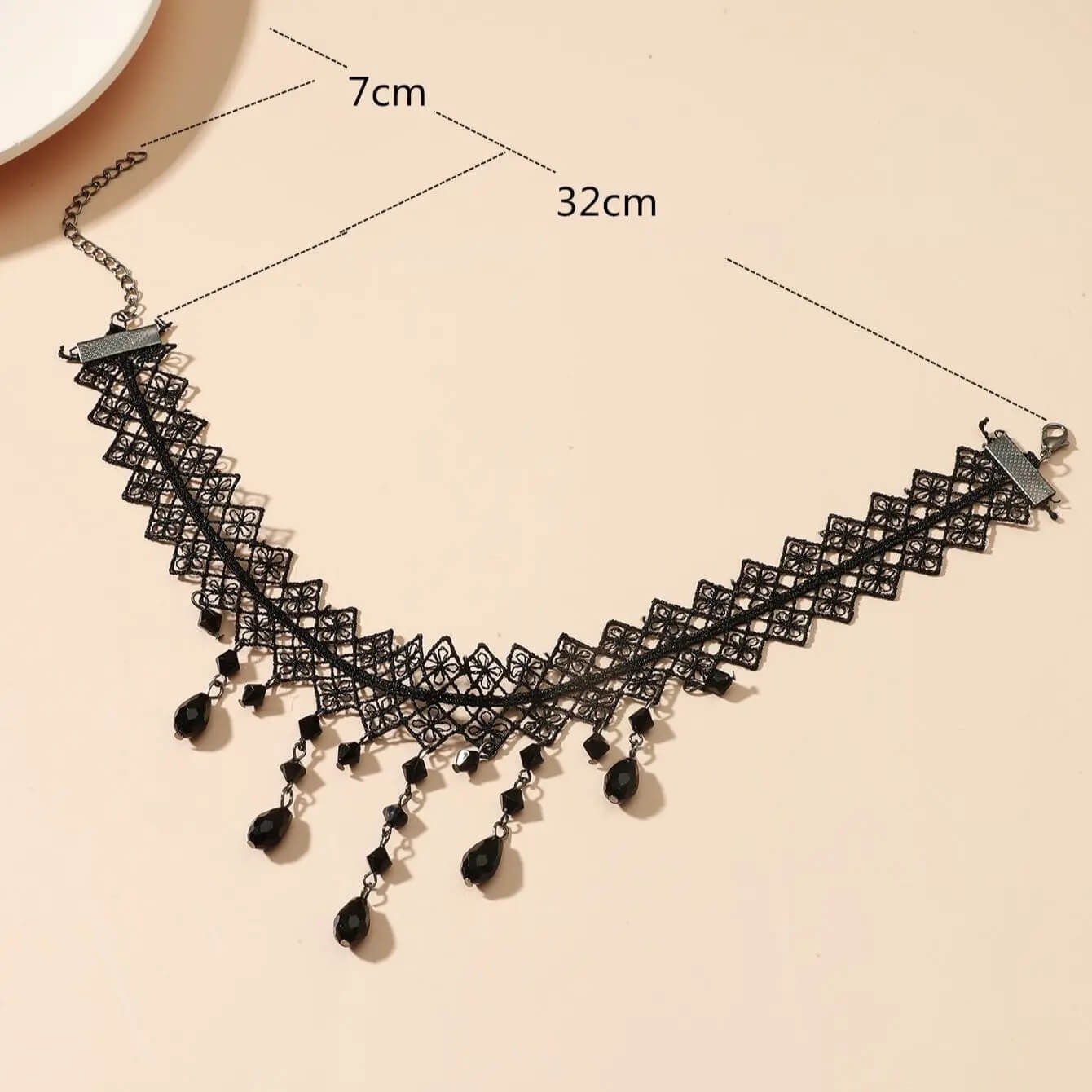 Découvrez le collier Philomène, une pièce délicate conçue pour sublimer votre port de tête. Sa dentelle fine épouse la ligne du cou, tandis que ses pampilles de perles facettées captent la lumière à chaque mouvement, ajoutant une touche de raffinement subtil à votre allure.