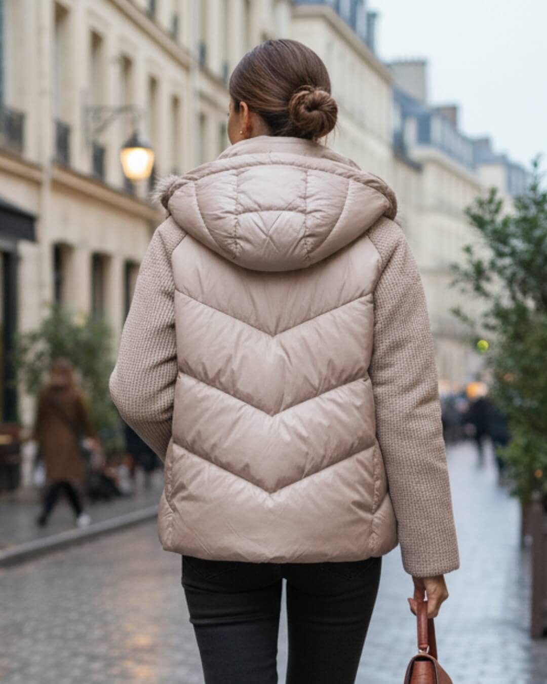 Design Bi-Matière Unique : Le corps matelassé assure une isolation optimale, tandis que les manches et les épaules en maille tricotée à reliefs apportent une touche de sophistication et une texture inattendue.
