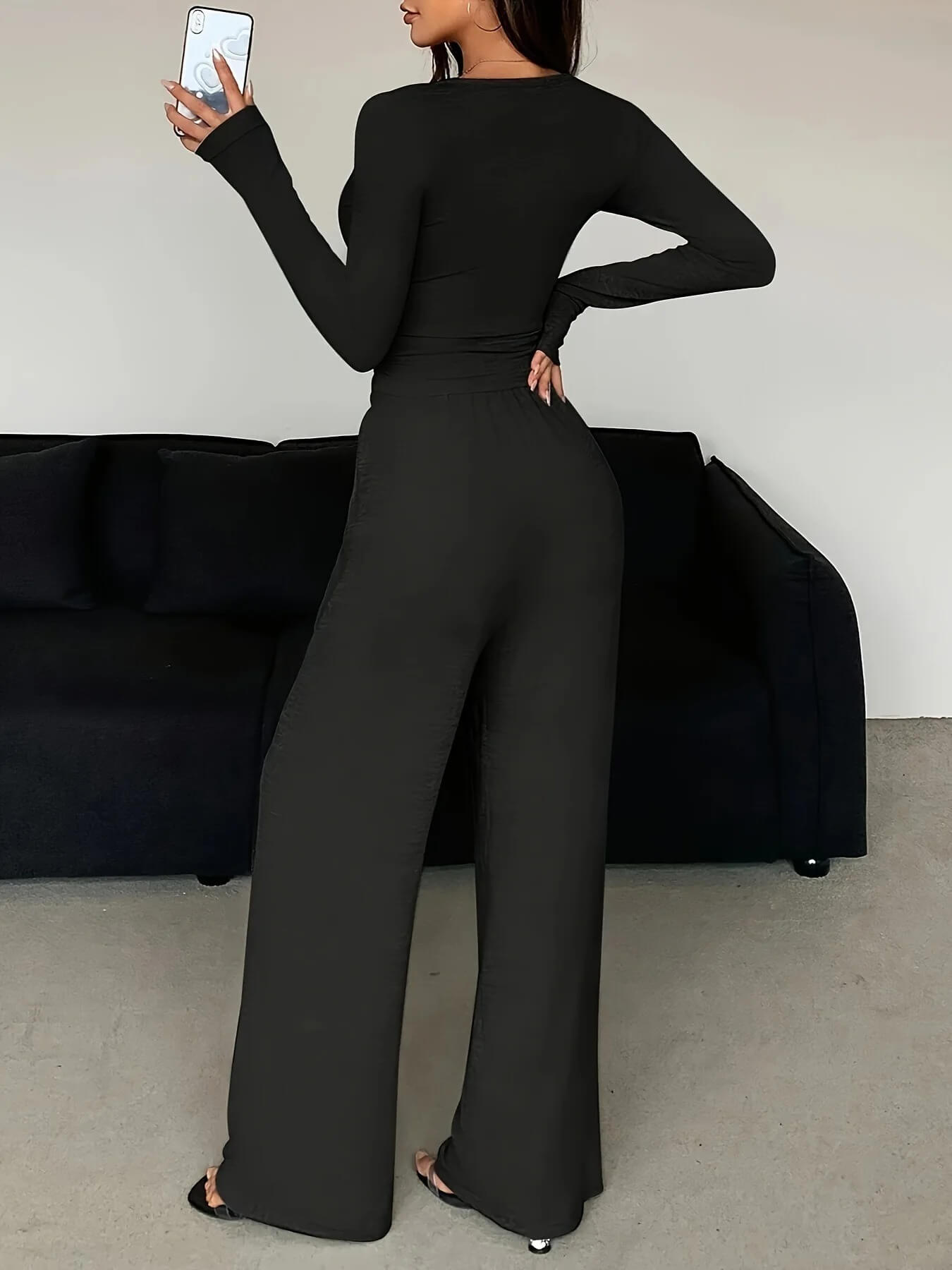 Le top à manches longues et le pantalon fluide s’harmonisent en toute simplicité pour créer une silhouette épurée et féminine. Un duo intemporel qui allonge la ligne et sublime la silhouette sans effort.