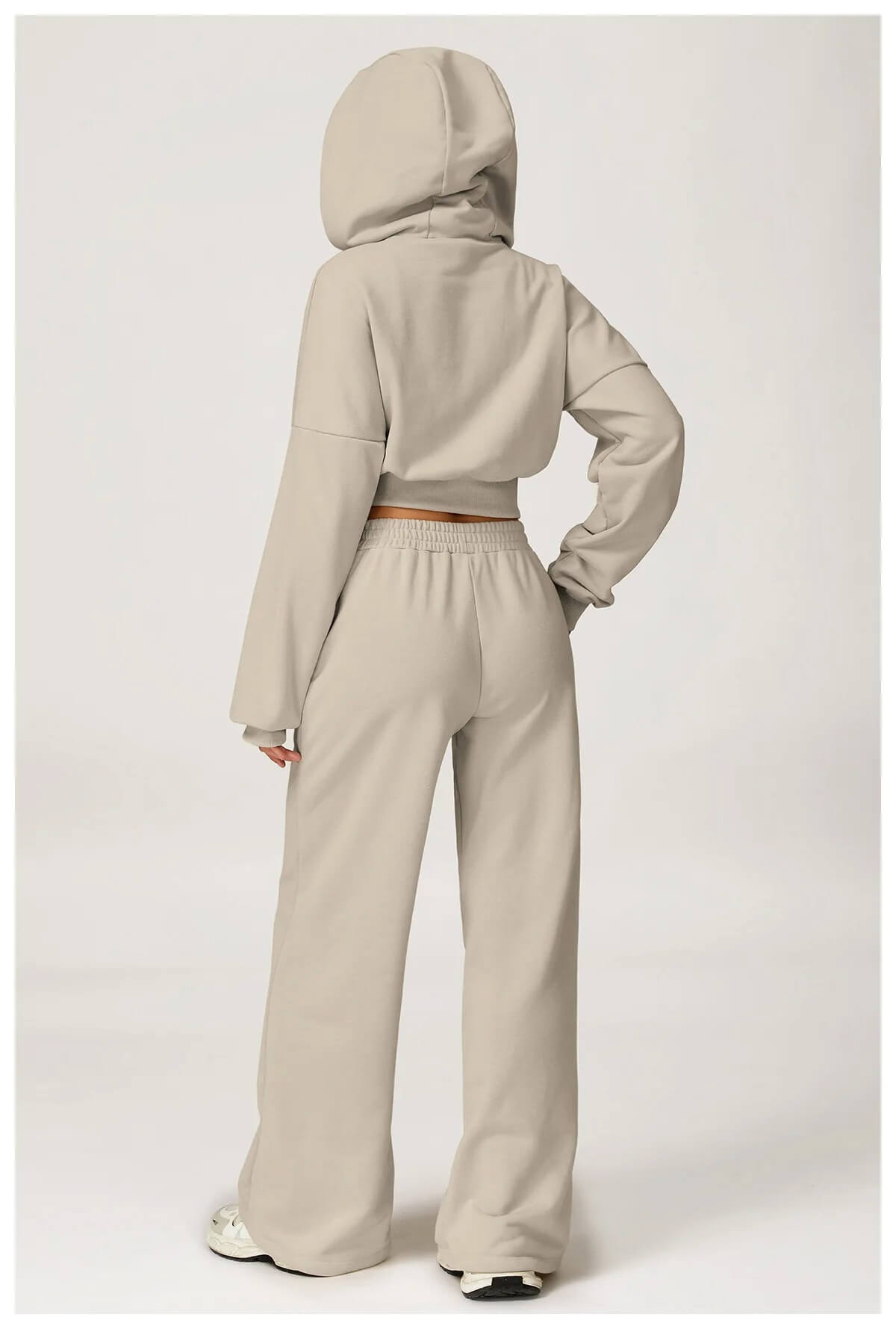 Le sweat court apporte une touche moderne et féminine, tandis que le pantalon large structure la silhouette tout en gardant une liberté totale. Un ensemble à la fois doux, minimaliste et agréable à porter au quotidien.