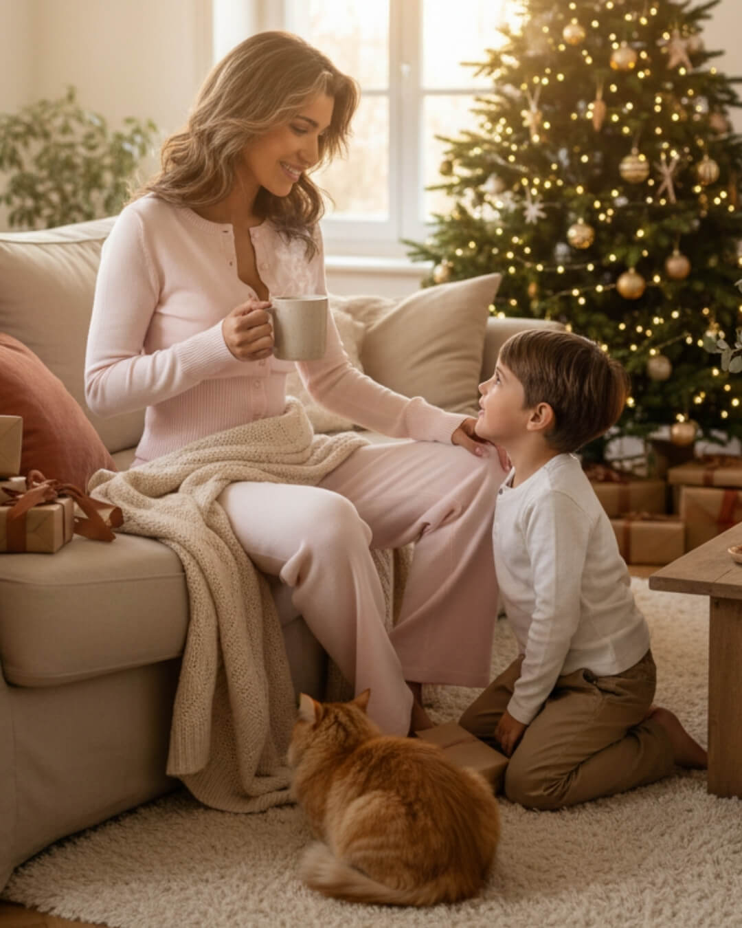 Son gilet court souligne délicatement la taille, tandis que le pantalon fluide allonge la silhouette avec naturel. Un duo intemporel, aussi agréable à porter à la maison que lors de vos moments de détente ou vos sorties décontractées.