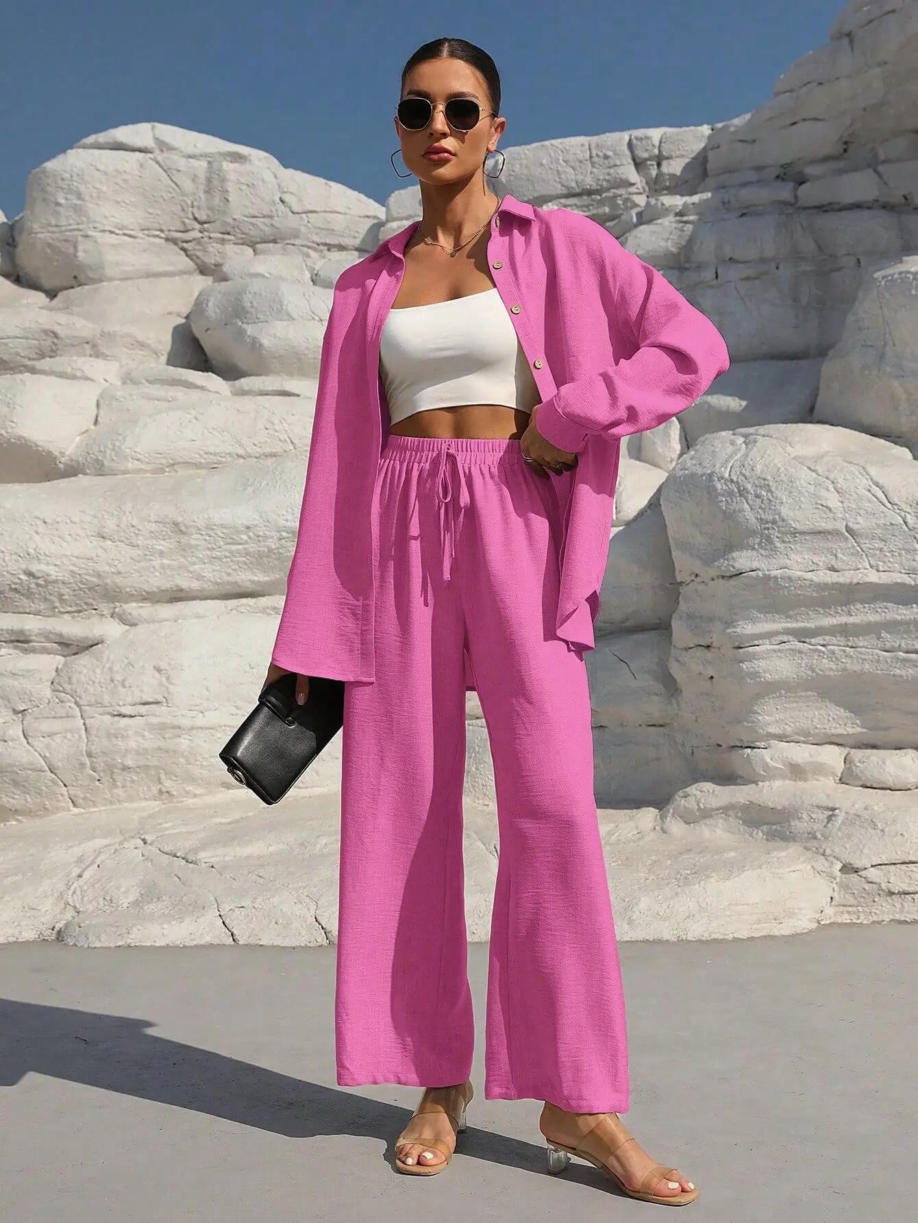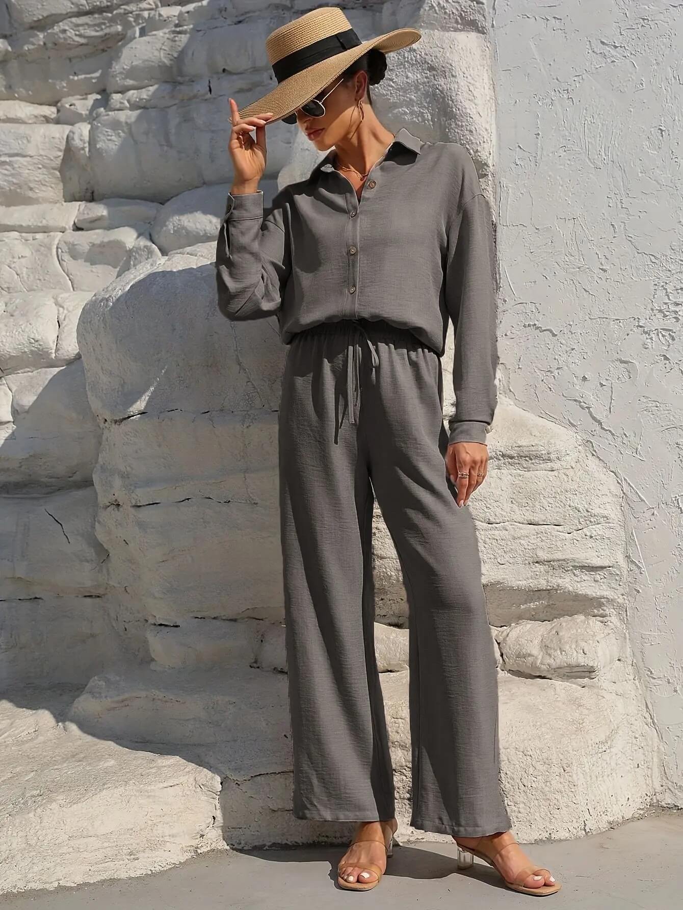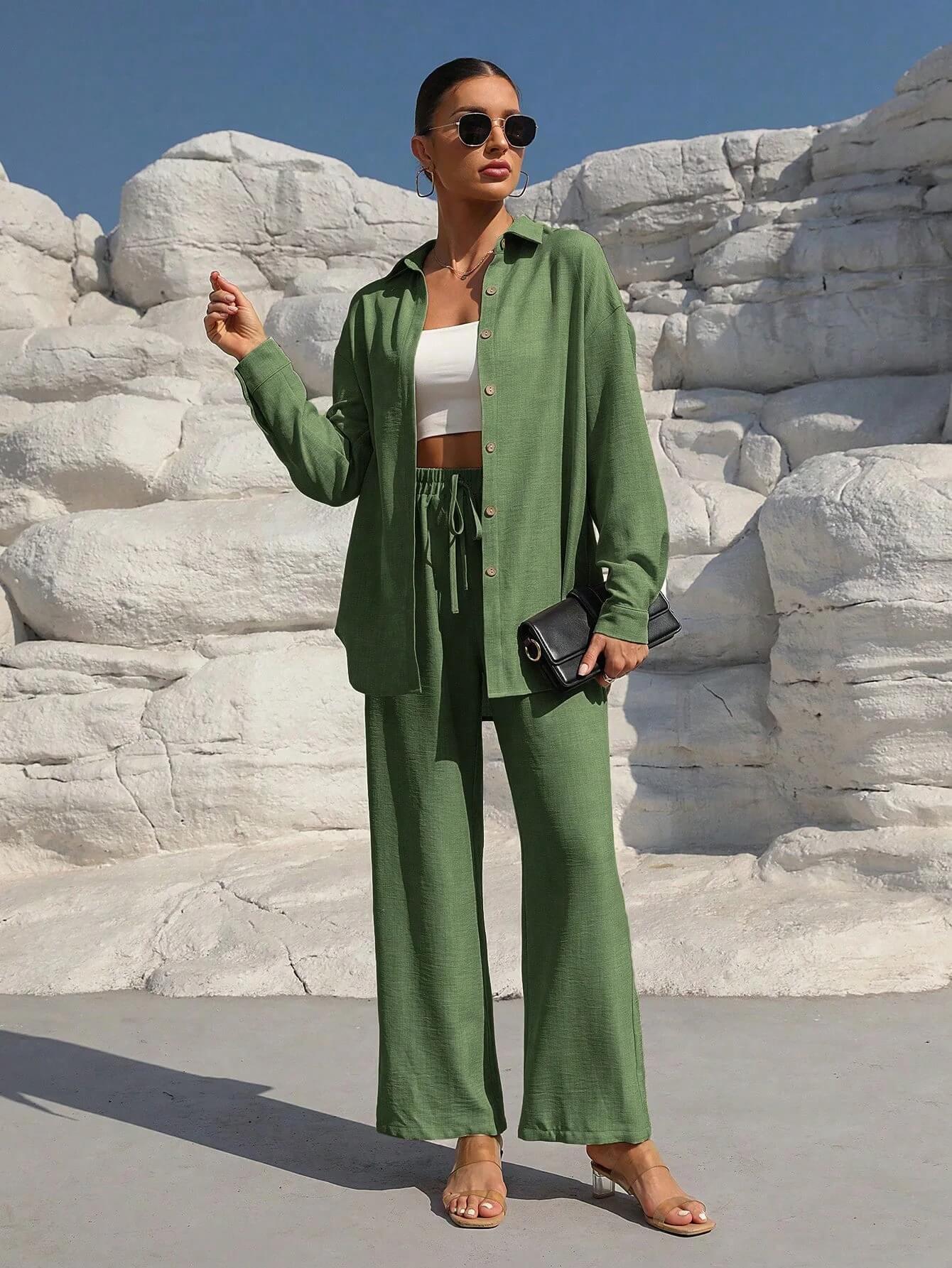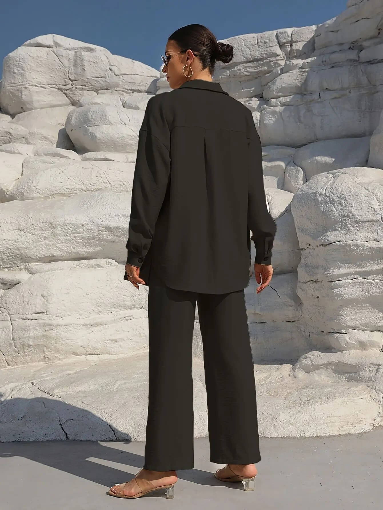 Une Silhouette Fluide et Élégante : La coupe ample de la chemise oversize et la fluidité du pantalon large créent un mouvement gracieux et une allure sophistiquée, assurant une liberté de mouvement totale.