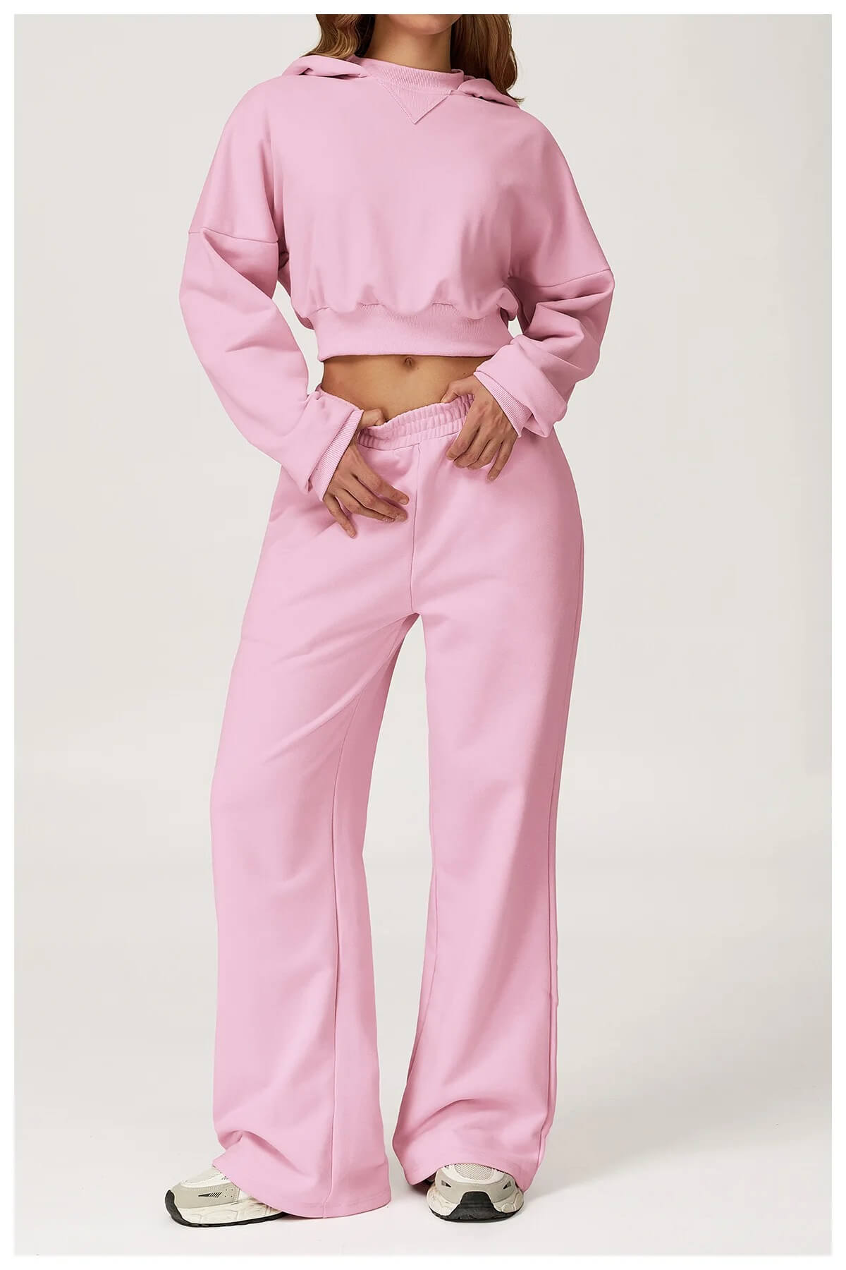 Une silhouette tendance : L'association du sweat court à capuche et du pantalon large à taille haute dessine une allure moderne et élancée, parfaitement dans l'air du temps.