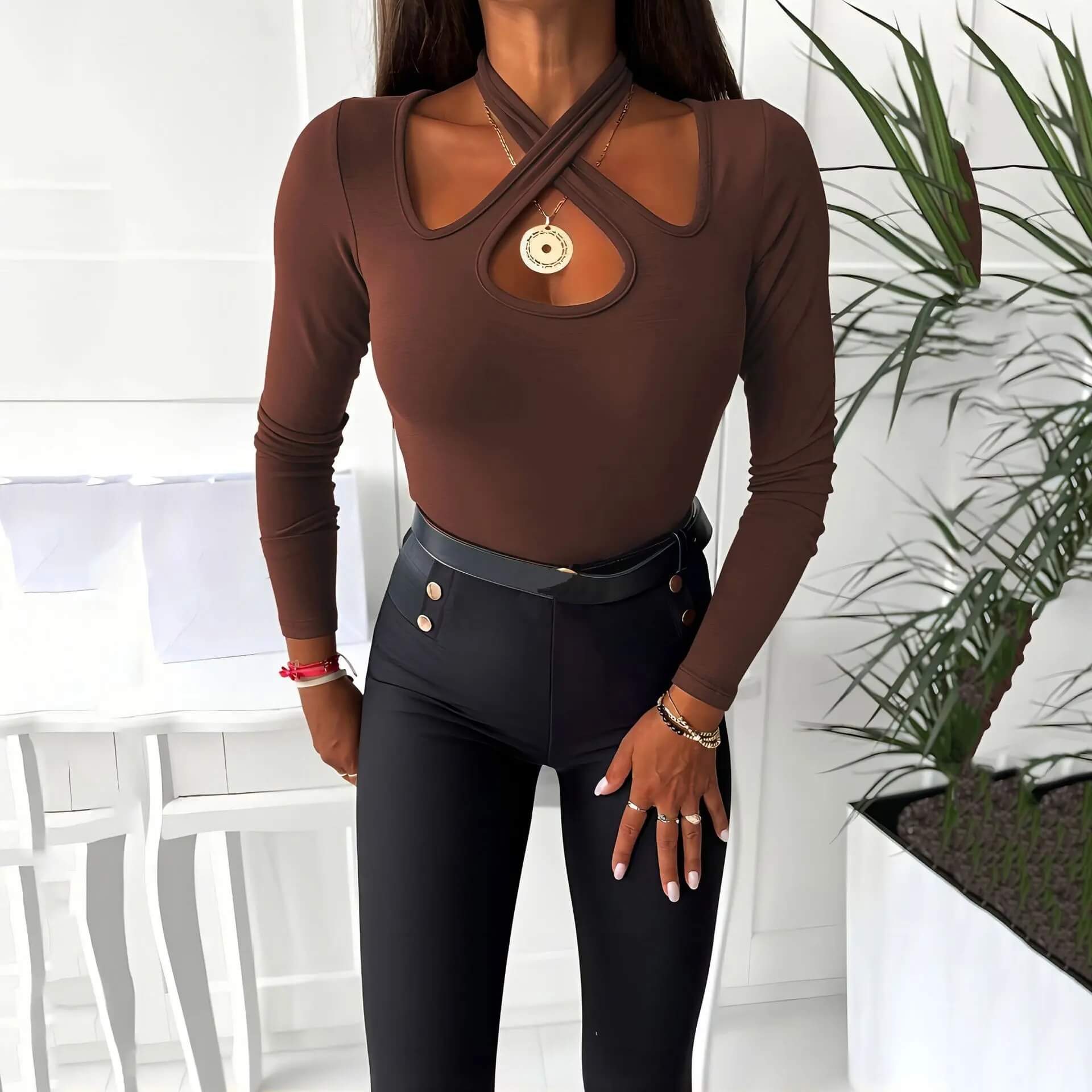 Design Audacieux : L'encolure croisée asymétrique, rehaussée de découpes graphiques, crée un point focal unique et sophistiqué qui met subtilement en valeur le décolleté.