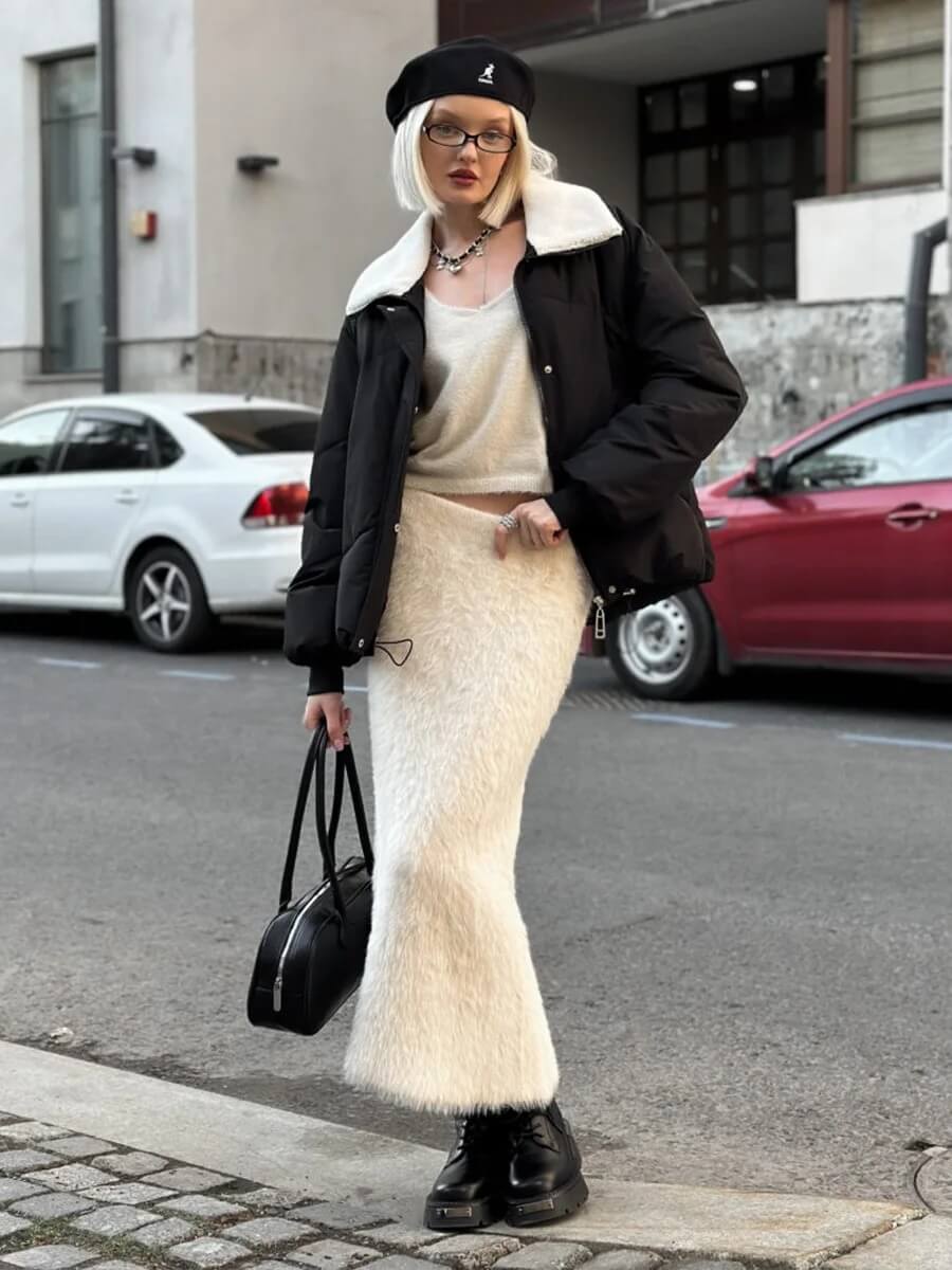 Texture unique : Sa maille effet fourrure offre une douceur incomparable au toucher et un visuel audacieux, idéale pour se démarquer avec élégance durant la saison froide.
