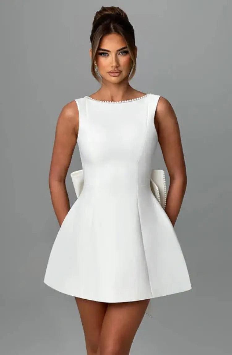 Nœud Bijou en Perles : Le point focal de la robe est un magnifique nœud entièrement confectionné en perles, apportant une touche de lumière et de préciosité à la tenue.