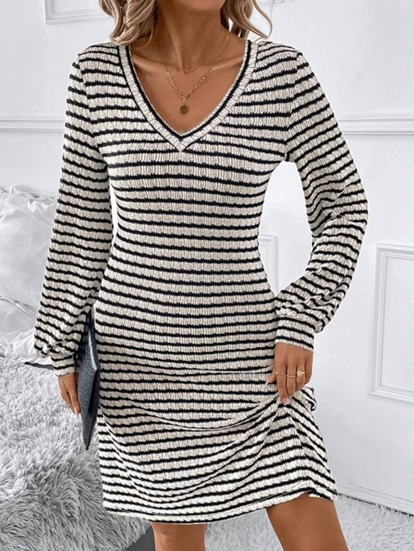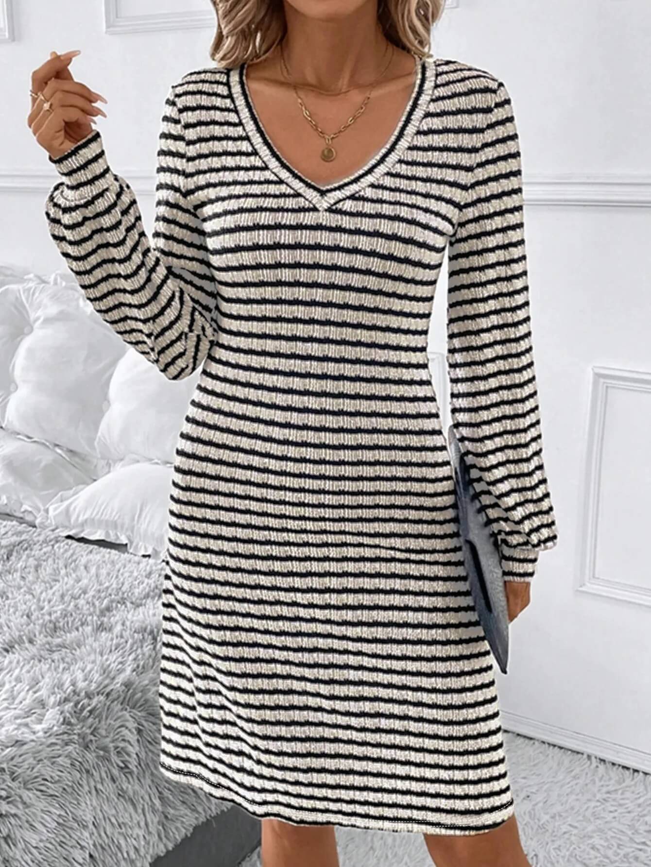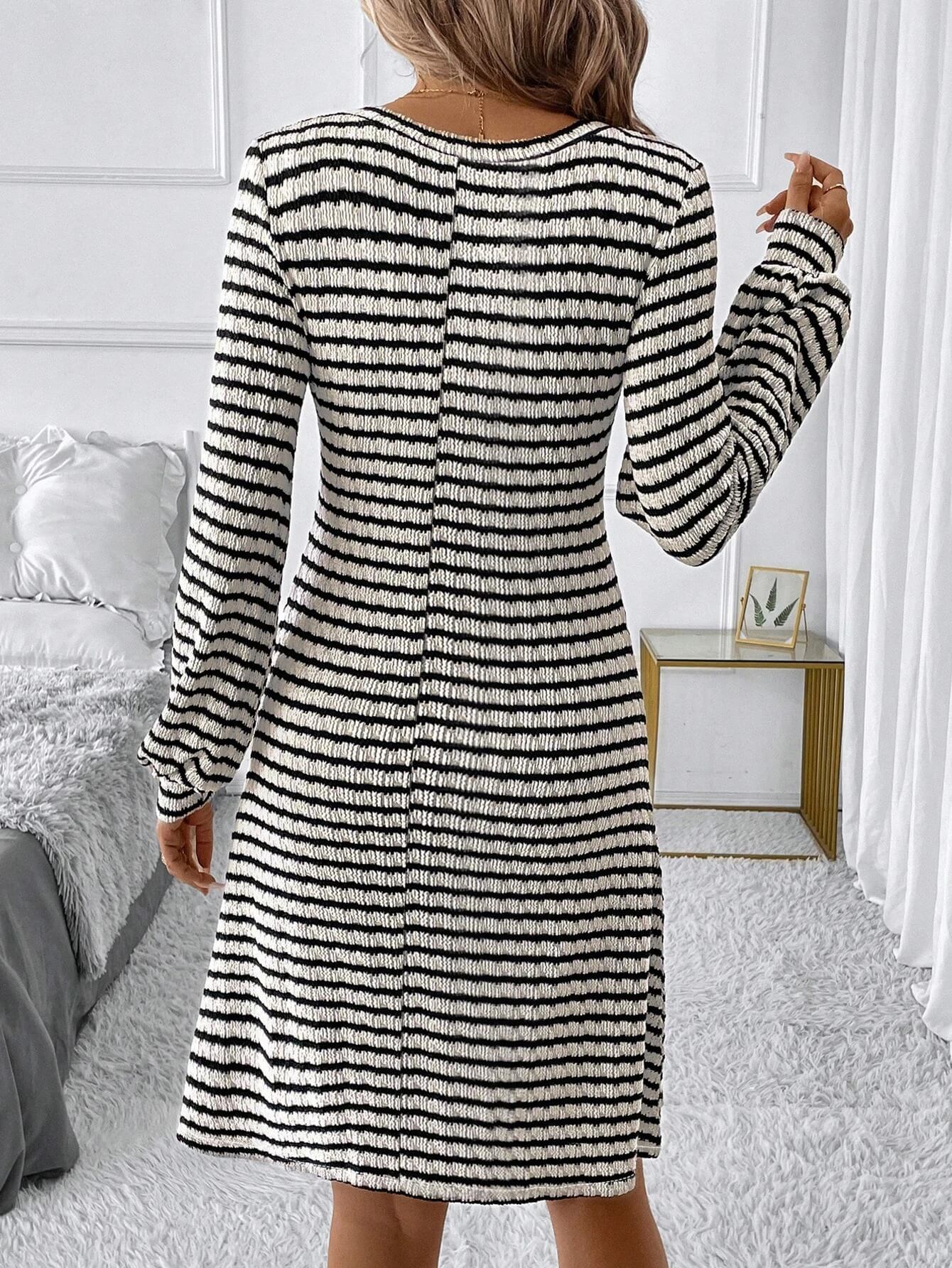 Une silhouette affinée : La texture de la maille côtelée, alliée au motif à rayures régulières, crée un effet d'optique qui allonge et sculpte la silhouette avec subtilité.