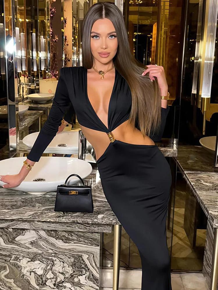 Équilibre et Élégance : La coupe longue et ajustée, associée à des manches longues, crée une harmonie parfaite qui équilibre les détails audacieux de la robe pour une allure chic et assumée.