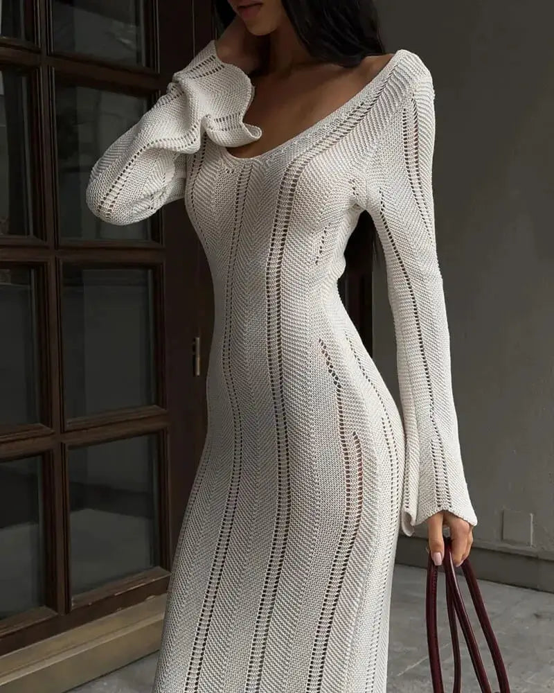 Une maille crochet d'exception : Le tissage ajouré, souligné par des lignes verticales, crée un jeu de transparence subtil qui allonge visuellement la silhouette avec raffinement.