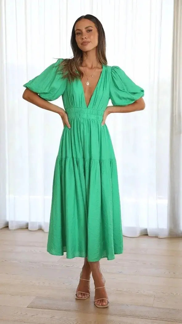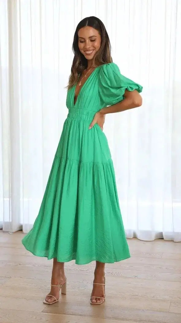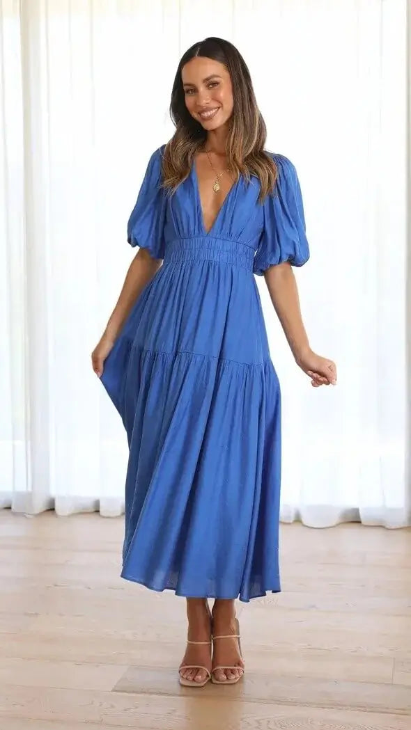 Touche de Modernité : Les manches courtes bouffantes, délicatement resserrées, apportent une note contemporaine et structurée qui équilibre parfaitement la fluidité de la coupe.