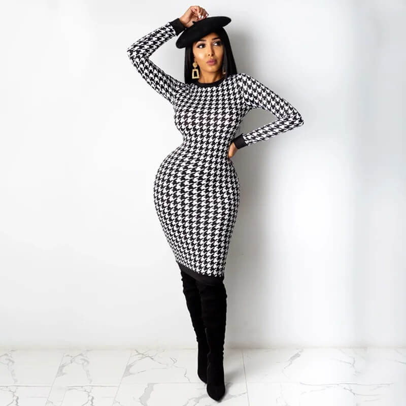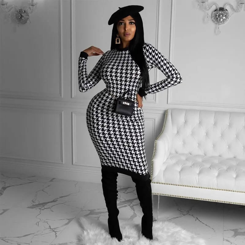 Découvrez la robe Elvire, la pièce maîtresse qui allie sophistication classique et allure contemporaine. Sa coupe moulante sculpte la silhouette avec précision, tandis que l'iconique motif pied-de-poule est sublimé par des finitions contrastées pour une touche de modernité.