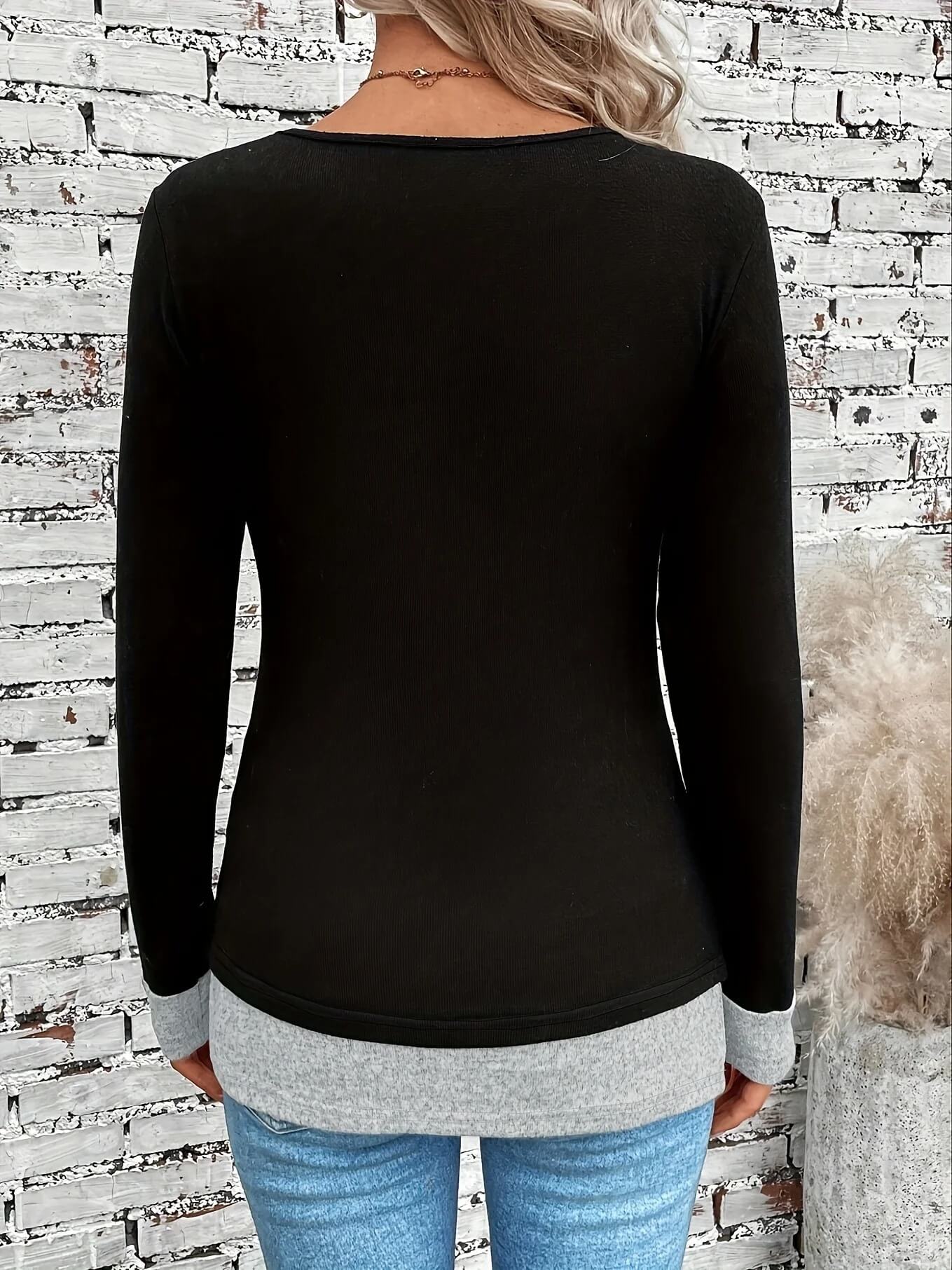 Un design trompe-l'œil : Il crée l'illusion parfaite d'une superposition de deux pièces, avec son encolure et ses revers de manches contrastés, pour une allure structurée et raffinée.