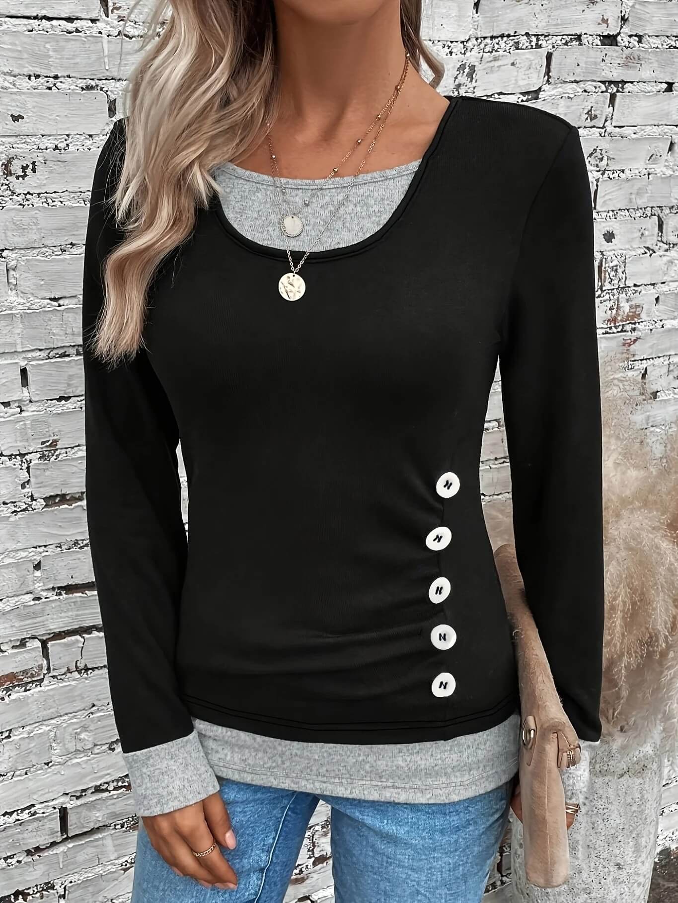Une touche d'originalité : Les boutons décoratifs subtilement placés sur le côté apportent une note contemporaine et un détail visuel qui distingue ce top.