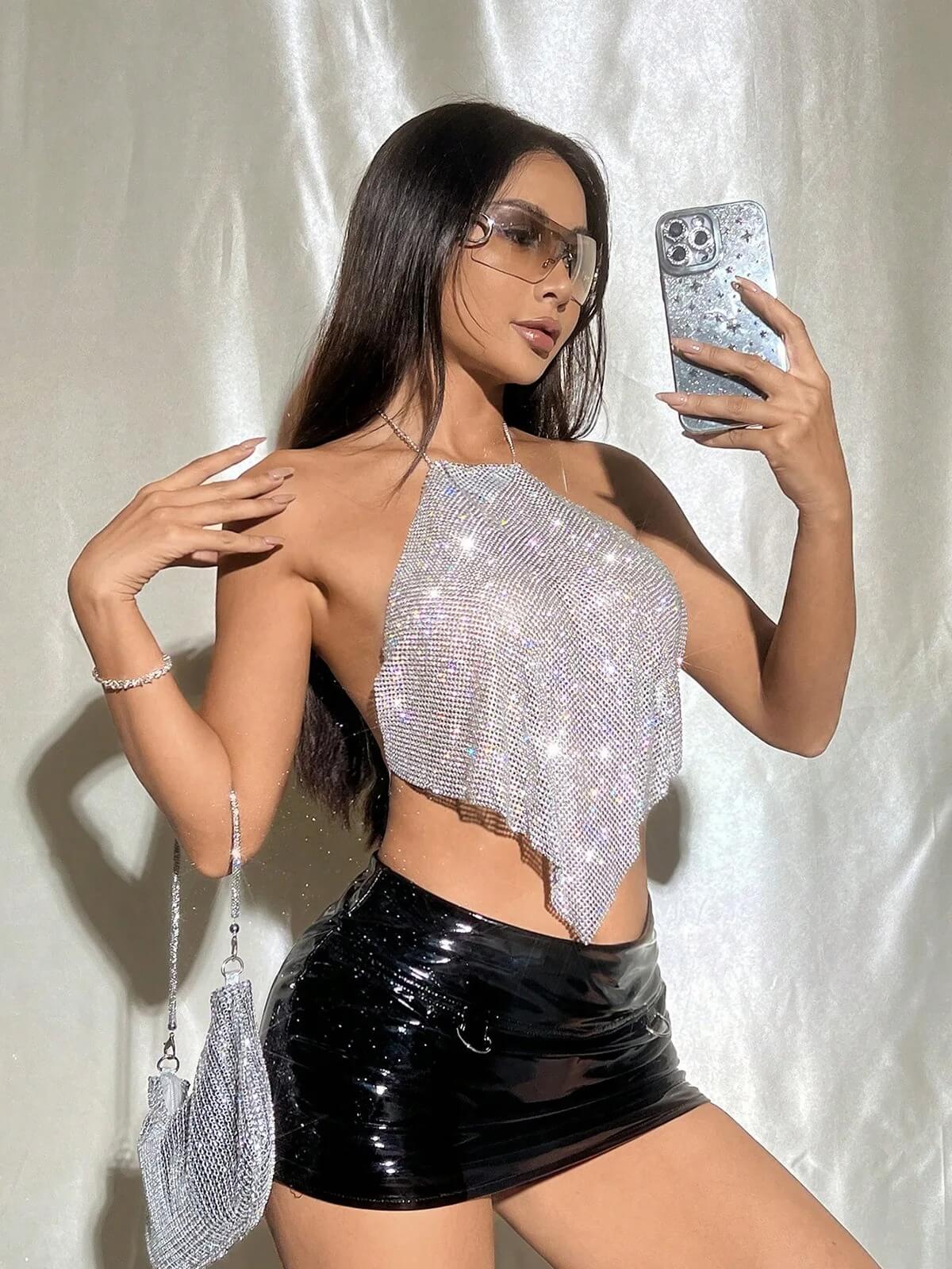 Éclat Métallisé :Confectionné dans une maille strass fluide, ce top capte la lumière pour un effet scintillant subtil qui illumine votre teint et attire tous les regards.
