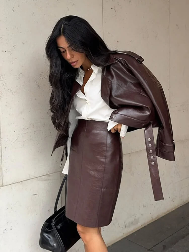 Une coupe oversize affirmée : Les épaules marquées et le volume maîtrisé dessinent une silhouette moderne et puissante, facile à superposer sur un pull en maille comme sur une robe légère.