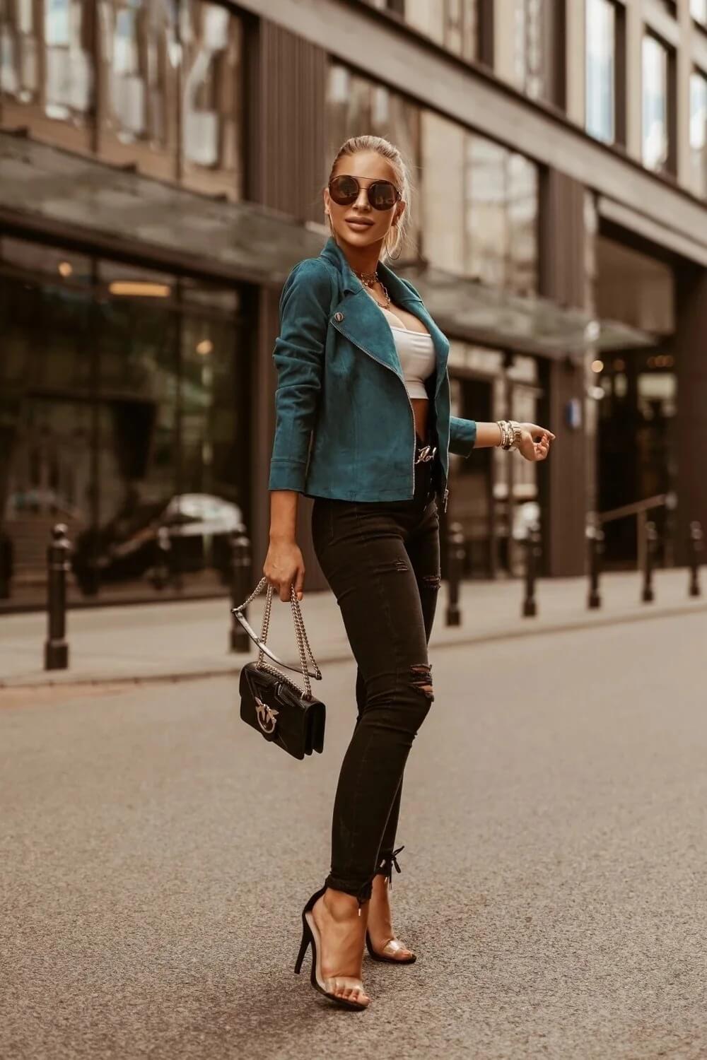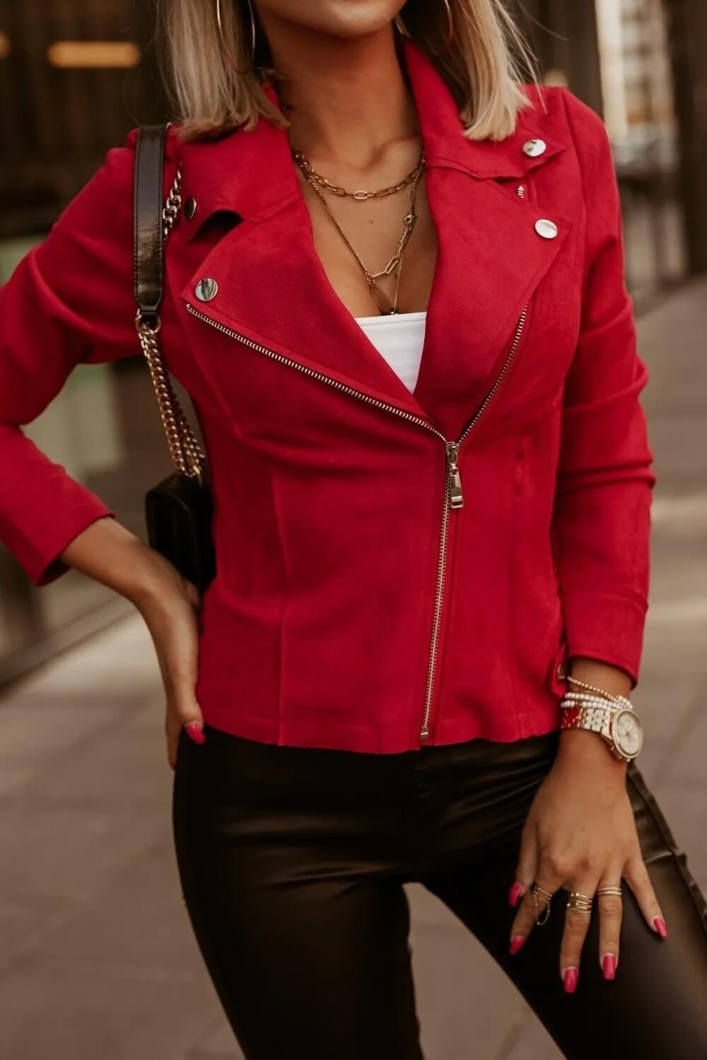 Texture Suédine Douce : Le tissu offre un toucher velouté et un confort remarquable, apportant une touche de modernité et de raffinement au design classique du perfecto.