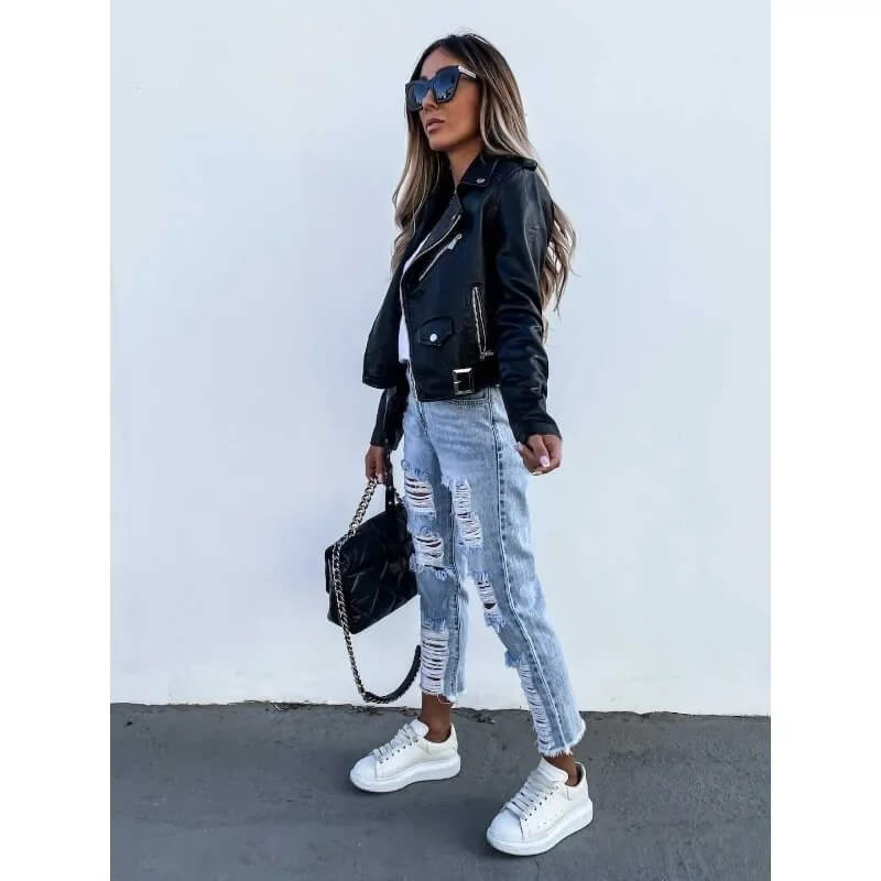 Silhouette Iconique : La fermeture zippée asymétrique, signature du style motard, structure la silhouette et apporte une touche d'audace à votre tenue.